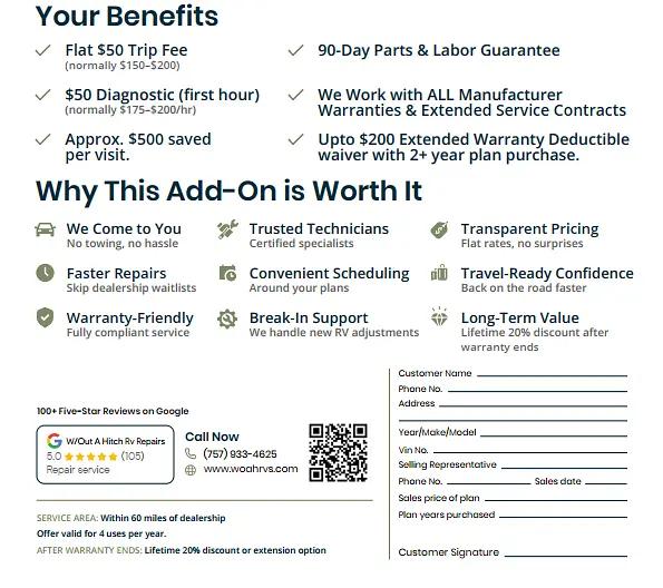 Buy now and get a bonus of $50 when you purchase a $100 gift card! The perfect gift for Rvers who want reliable, convenient on site repairs.